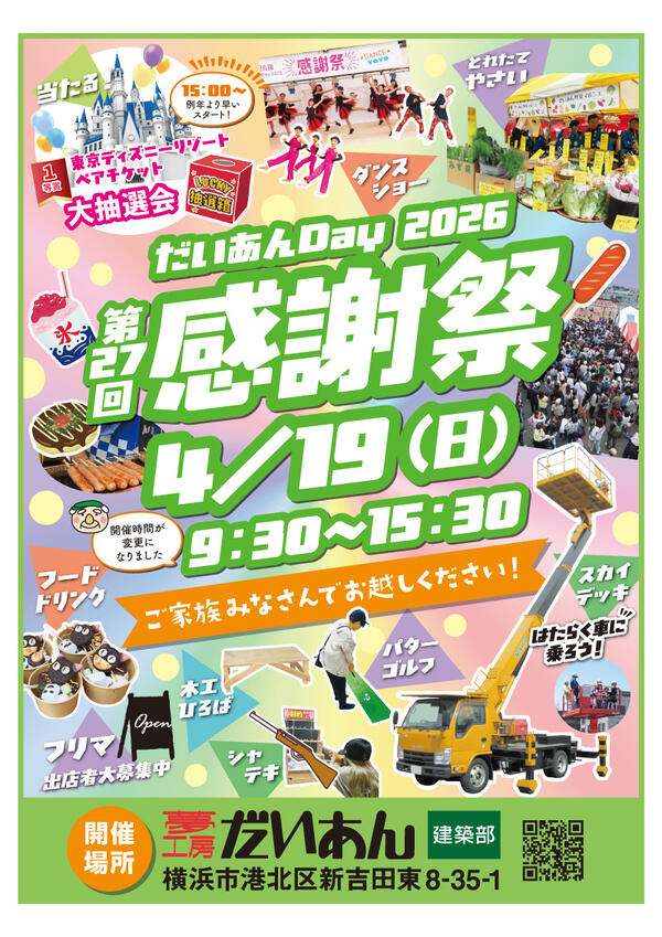 おなじみの屋台グルメや、お子様に大人気のはたらく車体験コーナー、豪華賞品が当たるお楽しみ抽選会など、ワクワクする企画をたくさんご用意してお待ちしております。