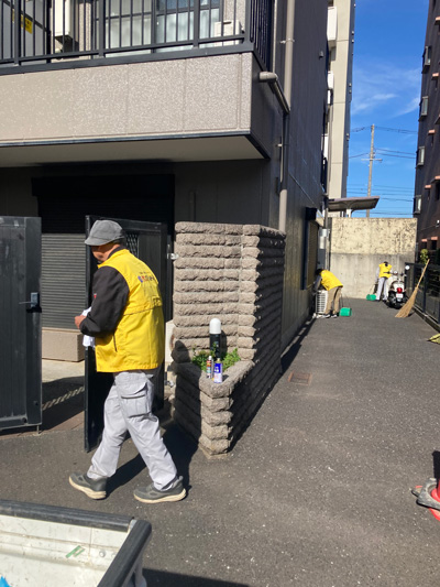 工事周辺の近隣清掃を行わせていただきました。青空の下、無事工事が完了し新しく塗装された建物の周辺をお掃除させていただきました。近隣の皆様には工事でご迷惑をおかけいたしました。今後ともよろしくお願いいたします。